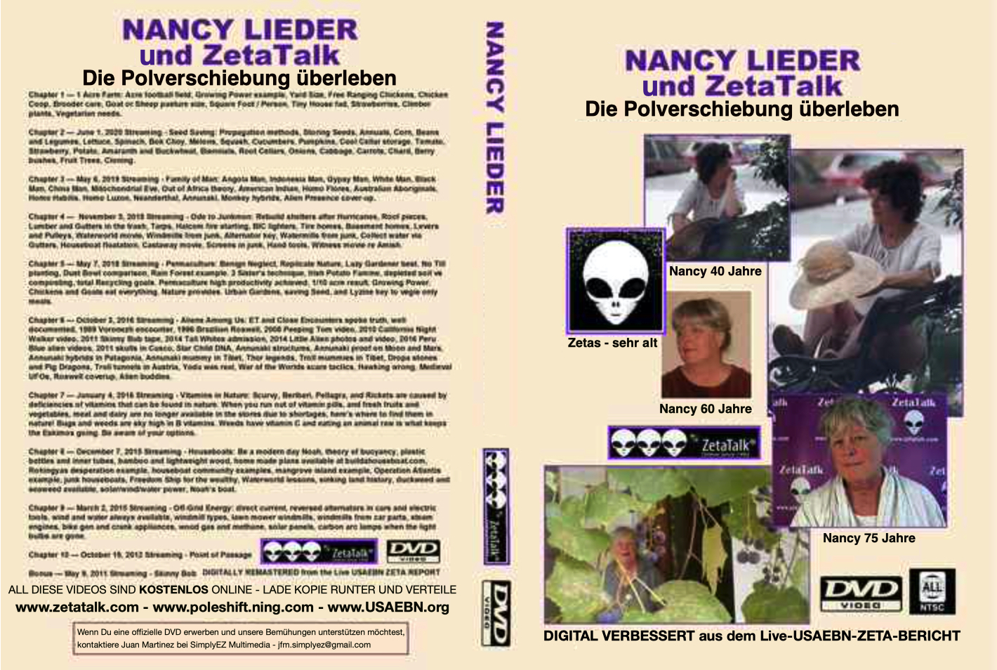 Wir, die Dienst-für-Andere-Zetas der ZetaTalk-Botschaft, geben auch Juan Martinez die Erlaubnis alle Zitate von uns wiederzugeben und zu verteilen die in dieser ausgewählten Video-Sammlung enthalten sind. Wir haben Nancy bei dem Auswahlvorgang geführt um sie auf die besten Praktiken für autarke Selbstversorgung zu konzentrieren. Während der paar verbleibenden Jahre bis zur Polverschiebung wird das Internet durch EMP - Elektromagnetischen Impuls - angegriffen werden, weshalb persönliche DVD-Kopien ein praktischer Lösungsansatz sind.