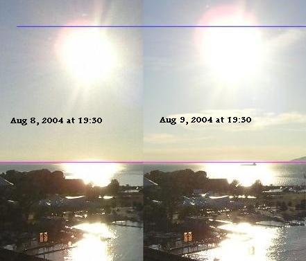 reflection on the water, the center Sun for Aug 8 superimposed on the photo for comparison purposes. A movement south at this rate