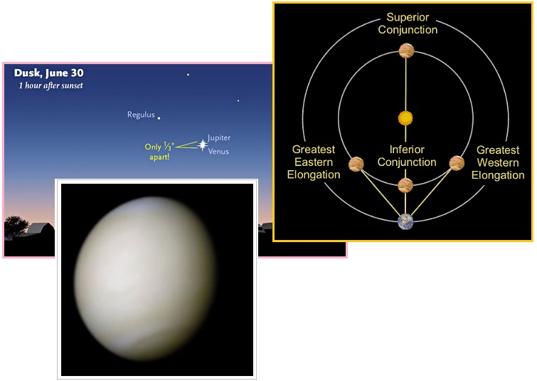 This simulate is doing now? And how to explain Elongation of Venus? [and from another] http://www.skyandtelescope.com/astronomy-news/observing-news/venus-and-jupiter-a-dazzling-duo-062520154/ Venus and Jupiter: Together at Last. The two brightest planets are gliding closer together in the early evening sky, and their celestial dance culminates with an ultra-close pairing on June 30th. [and from another] http://astro.unl.edu/naap/ssm/modeling2.html In Copernicus's heliocentric model the planets orbit in circles around the sun. One may wonder how Copernicus determined the order of the planets and the size of their orbits – after all, he had no benefit of pictures from spacecraft or even a telescope. He determined these things by measuring elongation. Elongation is the angle between the sun and a planet as seen by an observer on earth. [and from another] https://in-the-sky.org/news.php?id=20150606_12_100 Venus is said to be at greatest enlongation when it passes either of the two points along its orbit where it appears at greatest separation from the Sun.