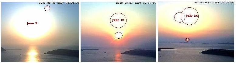 - Santorini has historically had the White Persona (small object) at the 2-3 o'clock position, as shown on June 9, and the Red Persona at the 6 o'clock position at sunset, as shown on June 21. This has changed. Notice that in addition to increasing size and occultation of the Sun, the White Persona has swung closer to the Ecliptic by July 24 and is now beneath the Sun, and the Red Persona is now occulting the Sun to the left. By July 28, occultation has progressed! Compare this position to the near occultation in Italy on July 29, and complete occultation by July 30!