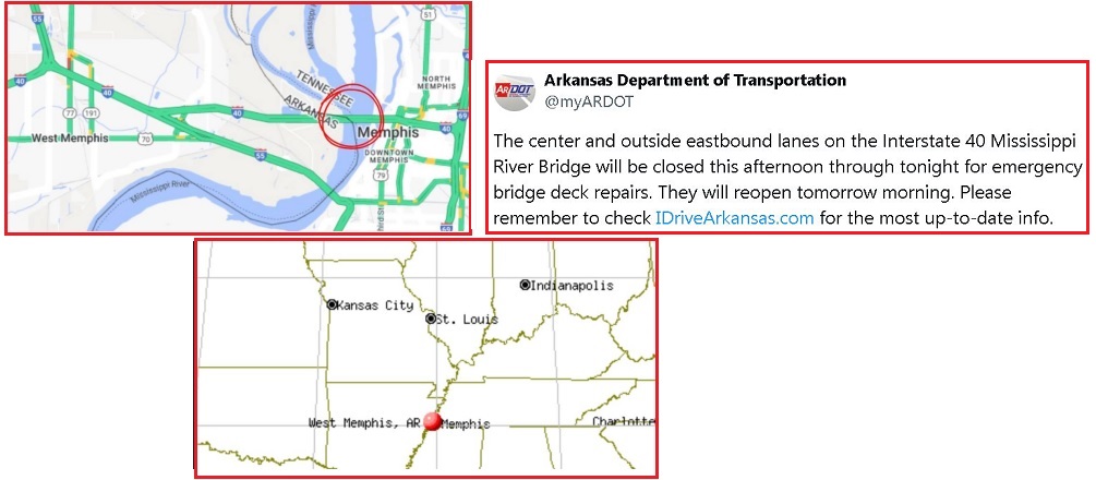 Центральная и внешняя полосы движения на мосту I-40 через реку Миссисипи будут закрыты с сегодняшнего дня до вечера в связи с экстренным ремонтом настила моста. Они откроются завтра утром. «Большая дыра в центральной полосе. Похоже, можно проехать насквозь. Затем на большом мосту в центральной полосе обнаруживается ещё одна большая дыра, в которой осталась только арматура